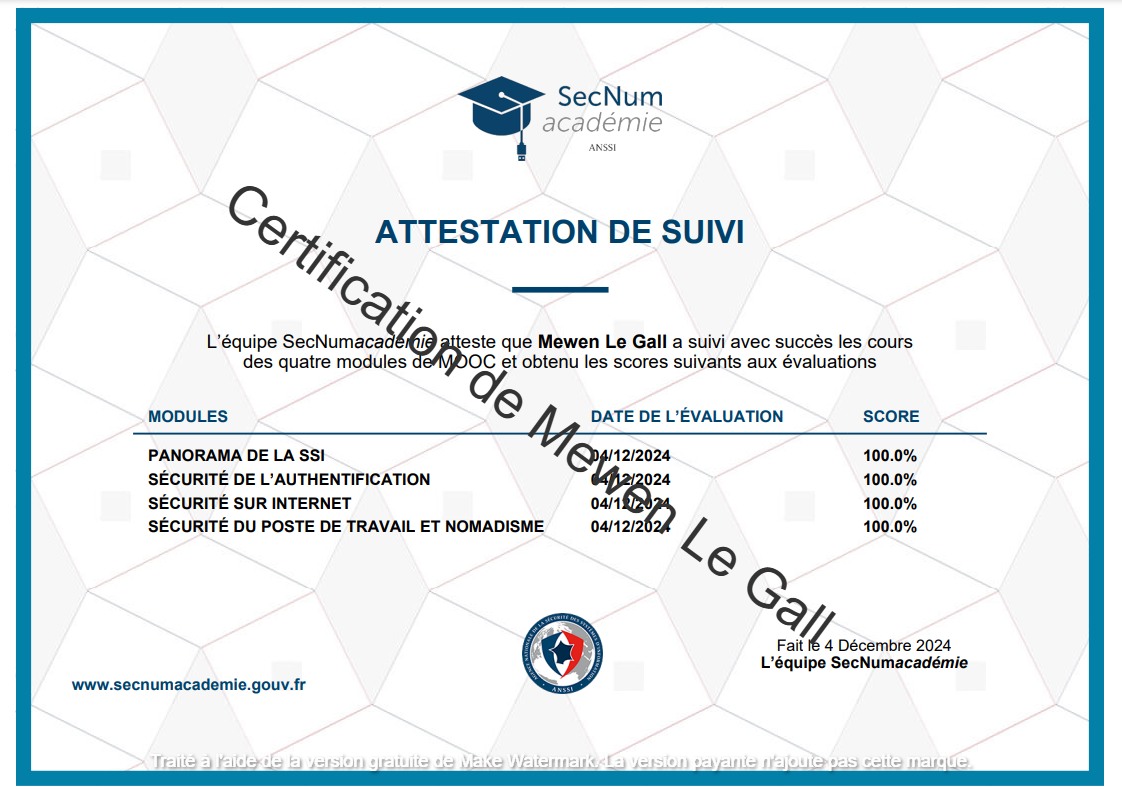 J’ai fais plusieurs formations sur la cybersécurité en autodidacte comme celle de l’ANSSI s’appelant la SecNumAcademie(comme vous pouvez voir au-dessus avec la certification). Je me suis également entraîné sur des sites web comme Root-Me, HackTheBox ou encore Hackropole formant à l’aide de challenges de cybersécurité.